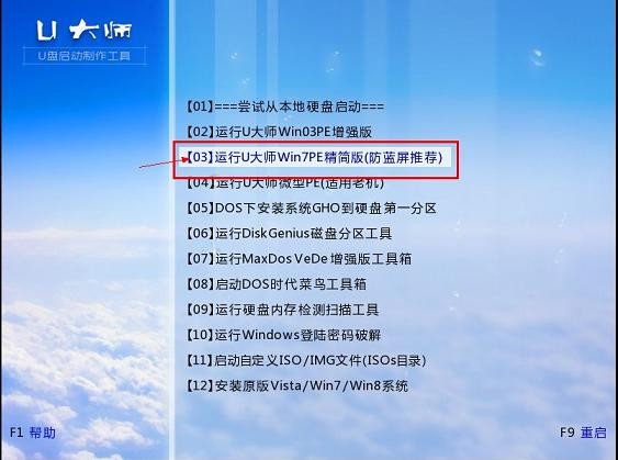 2.将启动U盘插上电脑,重启电脑,进入U盘启动选择菜单,这里选择【03】,如图: