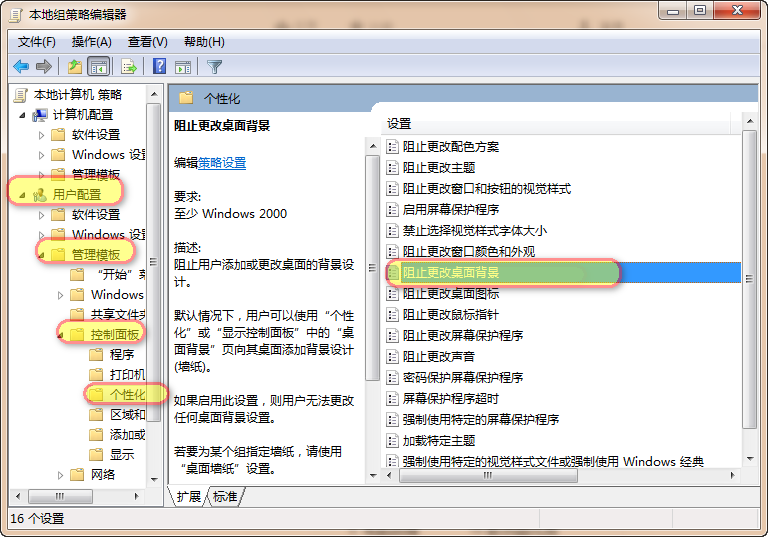 2.依次按下图打开用户配置,管理模板,控制面板,个性化,找到右边阻止修改桌面背景。