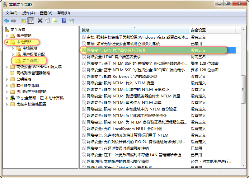 win7,开始菜单-> 输入secpol.msc, 打开本地策略,点开本地策略-》 安全选项, 右边下拉找到“网络安全:LAN管理身份证验证级别”