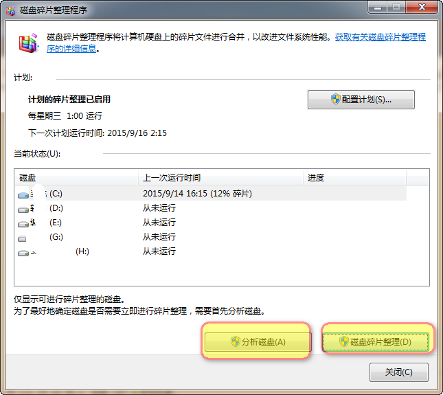 b) 整理方法,我们可以使用系统自带的碎片整理工具,但是整理时间比较成,建议在晚上睡觉之前打开整理,然后设置一个定时关机!
