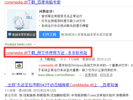 比如本图的coremedia.dll百度之后我们能找到很多,随意找一个能下载的,点击下载。