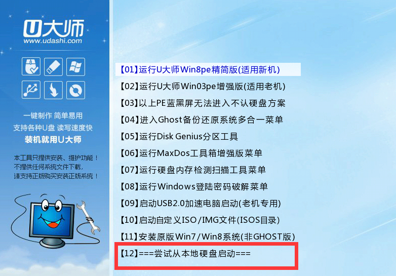 使用u大师自带的启动项,尝试从硬盘启动,检测我们安装的系统是否有问题,如果没有问题,选择以后就可以正确安装或者进入系统!