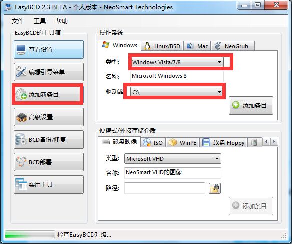 打开easyboot软件,选择添加新条目,选择windows7,选择我们win7所在的盘符,然后添加就可以了。