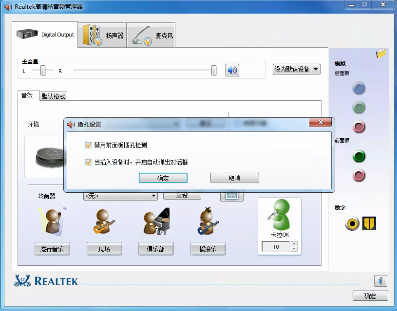 打开之后会有一个插孔设置,我们需要警用前面板检测才能正确更改默认设备!