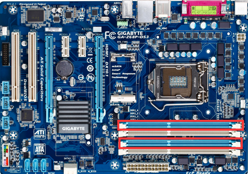 第2步:拆开机箱,并找到内存插槽,找到颜色相同的插口,相同的插口上表示双通道的意思,这个时候我们拨开你两边的白色卡子,将内存条按上,直到听到“咔”的一声就表示安装成功!