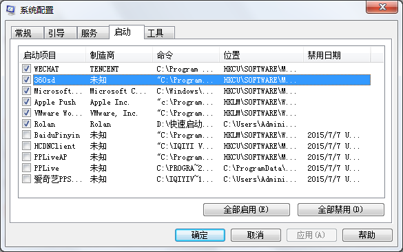 通过上图,我们可以很容易的看到各个程序在什么阶段启动,我们可以直接禁用没用的,当然如果搞不清,好使用简单的工具,例如360的一键优化等等!