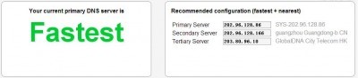 这次测试结果表明,快的DNS还是本地电信DNS。同时,测试结果建议:首选DNS为202.96.128.86,备用DNS为202.96.128.166,第三DNS为203.80.96.10。