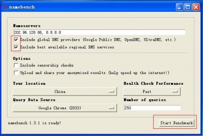1、如上图,勾选“Include global DNS providers(Google Public DNS,OpenDNS ,etc.)”及“Include best available regional DNSservices”;2、点击“Start Benchmark”。