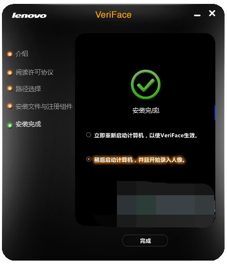 2、安装完成后,建议立即重新启动计算机,以便veriface生效;