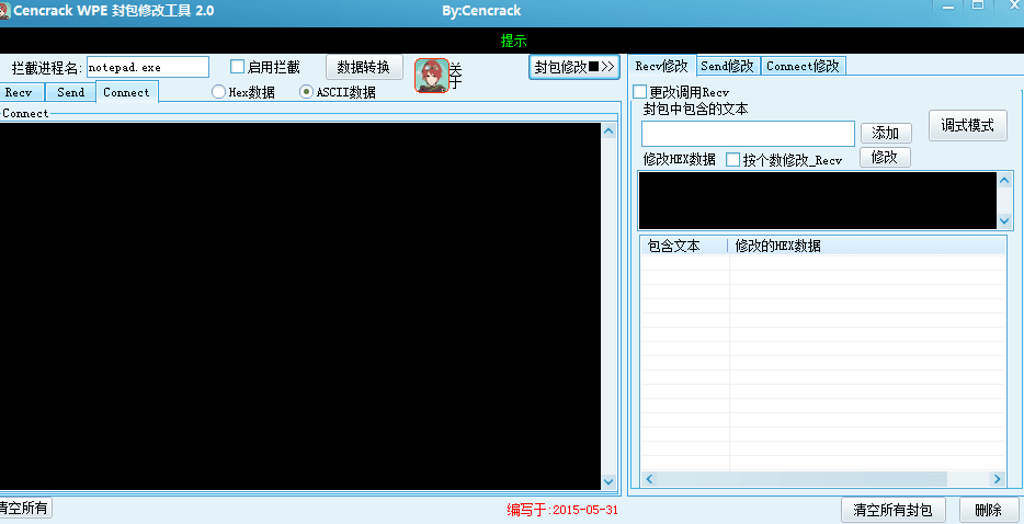 WPE封包修改工具是一款好用的封包拦截工具,软件界面简洁直观,只有间隔必备的选项和按钮,方便操作。你只需要在拦截进程名中输入软件的全称,然后勾选启用拦截即可,软件的主体部分会显示ASCII或者Hex数据接收、数据发送和数据连接。