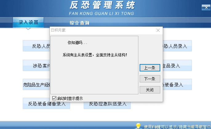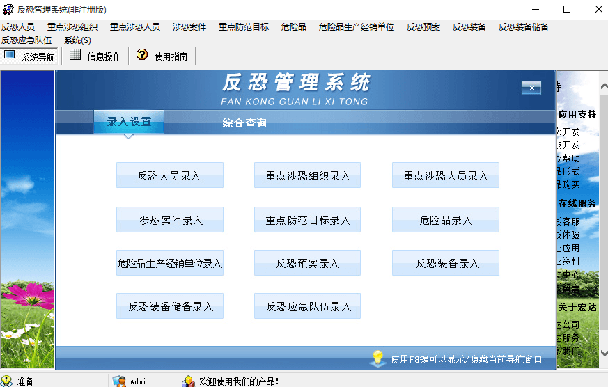 宏达反恐管理系统是一个功能十分齐全的反恐信息录入和管理软件,除了菜单栏上的主要版块外,软件还有系统导航、信息操作、使用指南三个小部分,你可以方便的进行录入设置、综合查询、信息分析等操作。