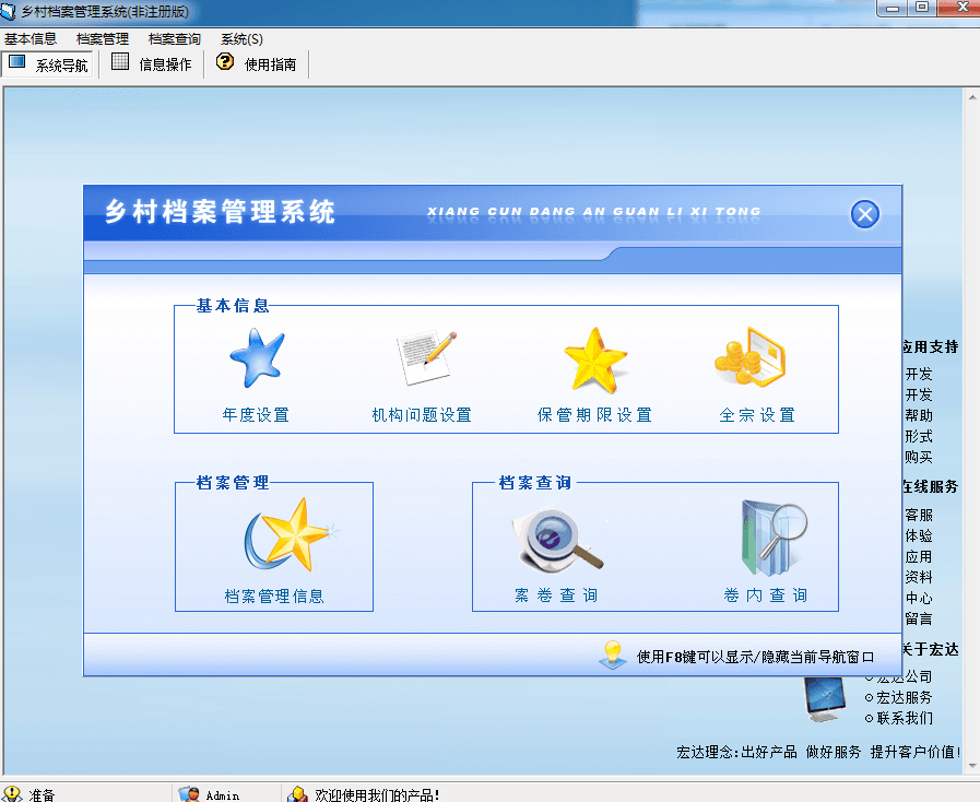 宏达乡村档案管理系统是一个简单实用的档案管理工具,具有基本信息、档案管理、档案查询、系统四大菜单,其中基本信息菜单中具有年度设置、机构问题设置、保管期限设置、全宗设置四个选项,非常直观,操作方便。